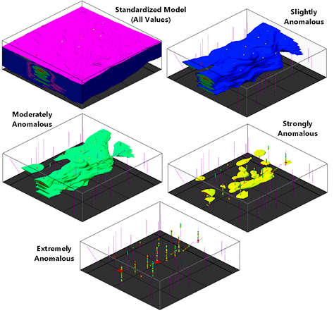 In the above graphic, we've used this terminology: Slightly Anomalous is > 1 (Mean +/- 1 Standard Deviation), Moderately Anomalous is > 2 (Mean +/- 2 Standard Deviations), Strongly Anomalous is > 3 (Mean +/- 3 Standard Deviations), Extremely (aka Outrageously, Insanely, X-Treme) Anomalous is > 4 (Mean +/- 4 Standard Deviations).