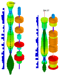 - Oblates: This will display the I-Data values as an oblate ("squashed") sphere in 3D logs. The oblate's radius will be determined by the data value and the oblate's height by the sampling interval (see Interval Thickness, above). Oblates can be plotted in a single color or color-coded based on data value, under the Fill Style heading. They are centered on the I-Data column axis.