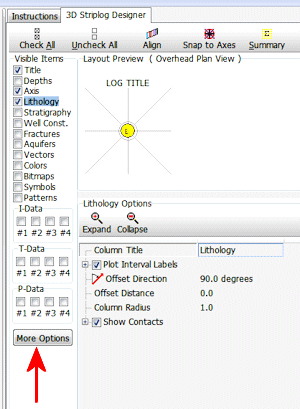 When you click on the More Options button in the RockWorks 3D Striplog Designer window, you'll see the following settings.