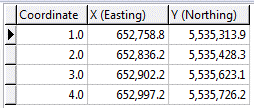 An "XY Coordinates" table is used to define a listing of X,Y coordinate locations to be used to define the panel endpoints in a RockWorks cross section diagram. While you can interactively draw cross section traces within a program window, RockWorks also allows you to specify a coordinate listing such as this, should you need really precise locations or wish run the program in command (RCL) mode.