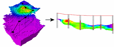 - "Slice" this model along any path and create a 2D cross section diagram. Because the model is interpolated across the entire project, you can place the section panels anywhere you like.