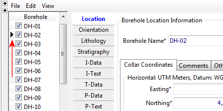 - In the borehole file listing along the left side of the Borehole Manager, click on the borehole named "DH-02" to make it active.