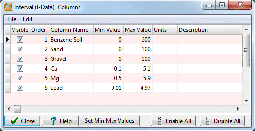 This defines for each component type its name (required) and its min and max values. You can also enter comments regarding units and descriptive notes. The Order column determines the left-to-right order of the columns in the display. The Visible check-box allows you to turn on/off the column display.