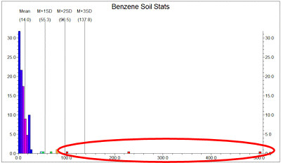 The program will read through all of the Benzene Soil measurements for all boreholes, compute the mean and standard deviation, and generate a frequency histogram plot. This diagram will be displayed in a RockPlot2D tab in the options window.