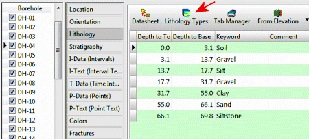 - Click on the Lithology Types button that sits above the lithology data listings.