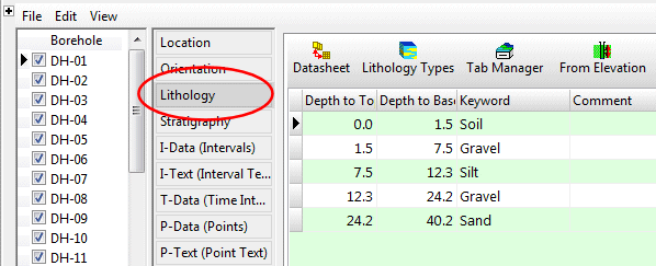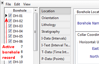 - In the borehole file listing along the left side of the Borehole Manager, click on the borehole named "DH-01" to make it active.