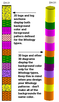 ! You might be wondering why the 3D log "tubes" don't contain any lithology patterns. Note that RockWorks displays only the background color in 3D logs and other diagrams, because of the OpenGL 3D graphics engine. In the next lesson, you’ll create a 2D strip log which will display lithology pattern designs.