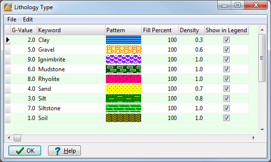 - G-Value: Lists the numeric value to be assigned to each rock type. As RockWorks creates a solid model of the rock types, the nodes will be assigned these numeric values rather than the words "clay" or "gravel". In the final model, then, all Sand zones will be coded with a "5.0", Silts with a "4.0", Clays with a "3.0", and so on. We'll review this in a later lesson when you create a model of the lithology across the study area.