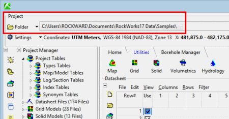 You will be returned to the main data window, with that folder displayed as the current project folder. All of the RockWorks-related files contained in this folder will be displayed in the Project Manager pane, along the left edge of the program window.
