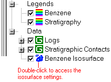 - Remove the check-mark from the Logs group and/or the Stratigraphic Contacts group and/or the floating image in the data pane, to see the isosurface more clearly. Or, you can expand either of those groups to selectively remove logs and/or surfaces.