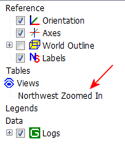 - Save a Viewpoint: Once you have a viewing point and zoom state that you like, let's save this for later retrieval. Click on the View menu and choose Add View. Type in a name for this viewpoint, such as "Northwest Zoomed In" or "Overhead", and click OK. You'll see this displayed under the saved Views in the data tree.