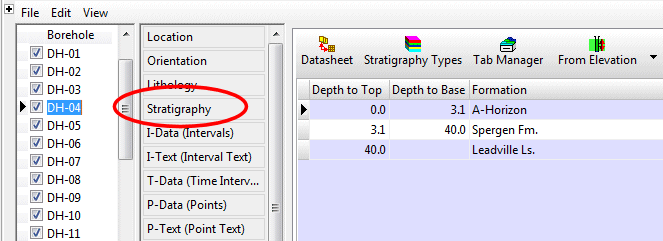! Note how the stratigraphic units are noted with a top and bottom depth, and a formation name. Missing data can be left blank (as in the Leadville Ls base depth above) and there are a set of "rules" which can help fill in the blanks. You can enter your formations or layers using regular words like "limestone" or "Leadville Ls." In order to know formation order, and the colors and patterns to be used to represent them, the program relies on a reference library called a Stratigraphy Types Table. This is created by the user. A Stratigraphy Types Table is created for each project that has stratigraphy information. We’ll look at this in a minute.