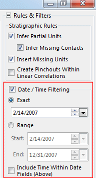 - Confirm that the Rules & Filters pane, on the right side of the options window, is still set to apply an Exact Date filter for 2/14/2007. (Note that the Stratigraphic Rules will be ignored since they don't apply to this T-Data model.)